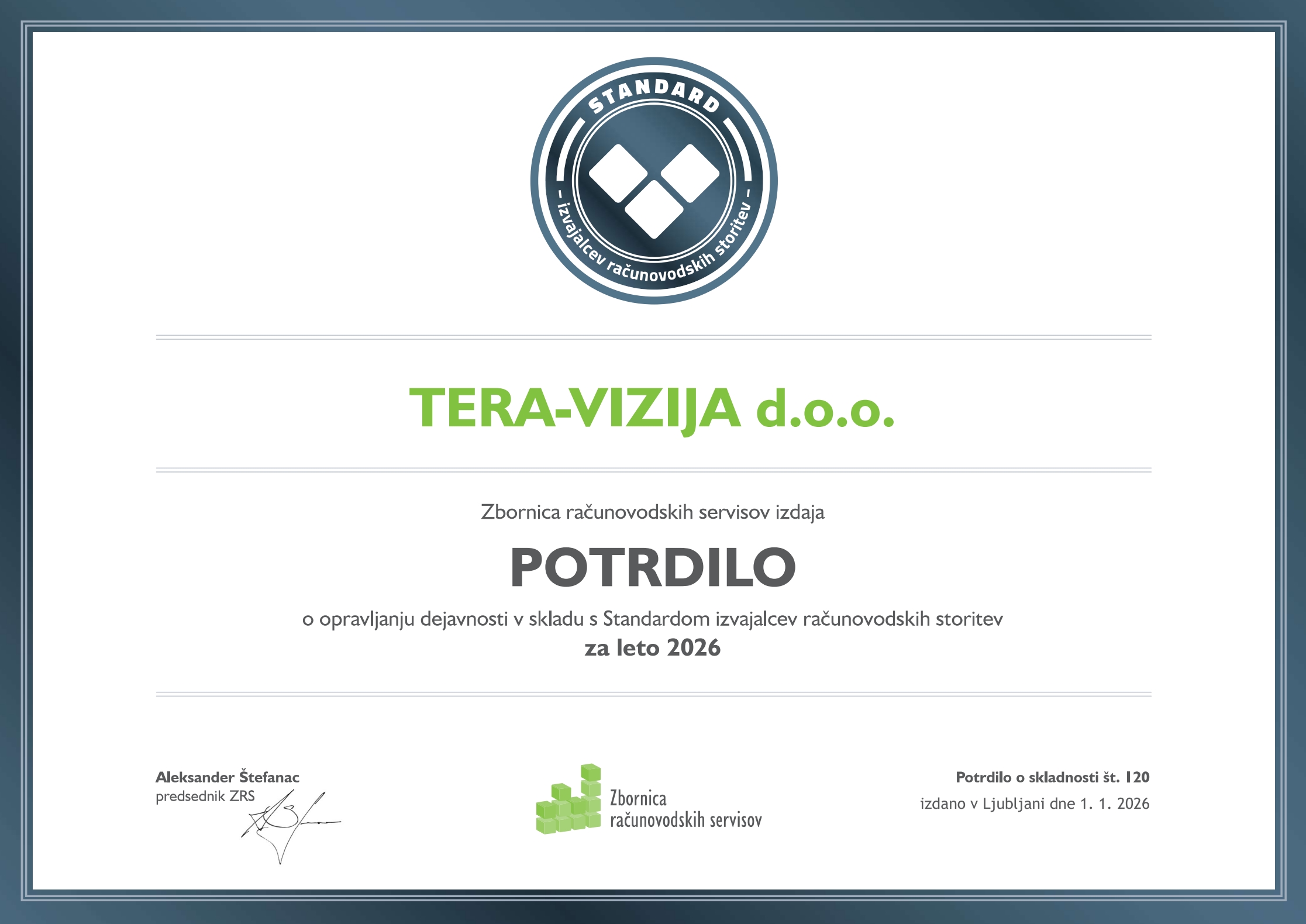 Prav tako smo pri Zbornici računovodskih servisov vpisani v Katalog certificiranih računovodskih servisov Slovenije pod številko vpisa 139. Prejeli smo tudi Standard znak za izvajalce računovodskih storitev vodeno pod številko 120.